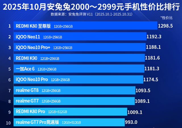 具体来说,在2025年10月份安兔兔2000—2999元手机性价比排行榜中,REDMI K80至尊版和iQOO Neo11分列第一名和第二名。在安兔兔平台上,这两款智能手机的性价比评分分别为1298.5分和1192.3分。其中,设计方面,K80 至尊版依旧是K80系列家族式的圆形DECO设计,不过取消了拼色元素,整体背板的一体性更强。得益于玻纤材质,K80 至尊版的背板相较于上一代减重6.5g,减薄0.2mm,使得整机的手感得到进一步提升。