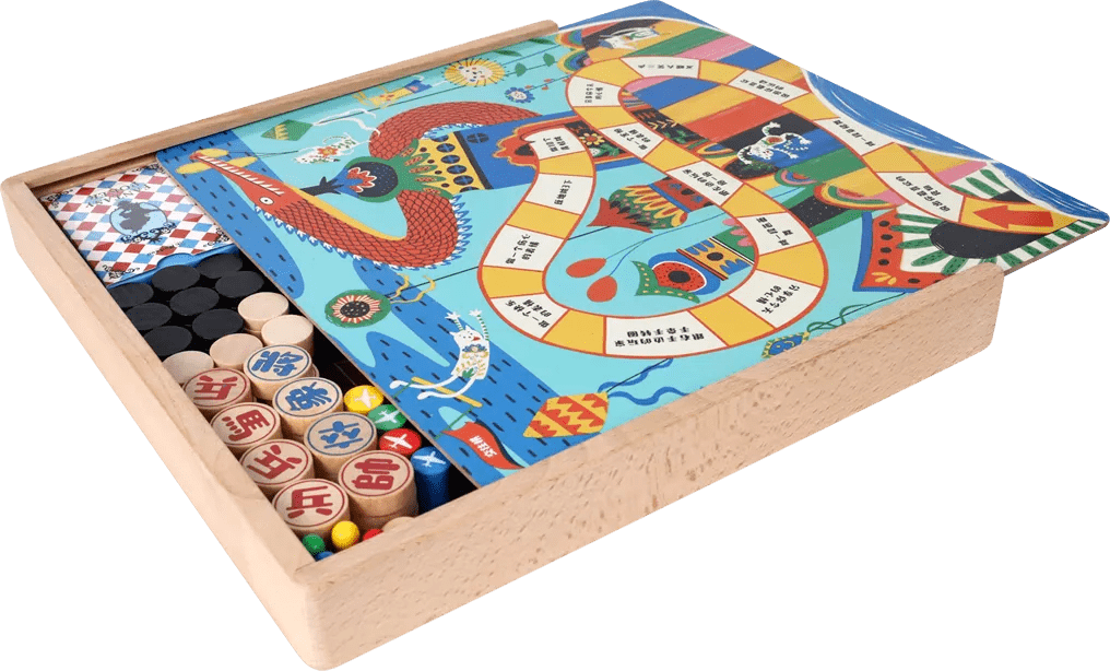 包含棋盒,一共有7块双面棋盘,即总共14面棋盘,部分游戏共用一面棋盘,14面棋盘足够玩所有游戏。有中国象棋、飞行棋等经典游戏,更有交往棋、益智交通棋等火星猪创新游戏。